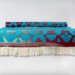 Handwoven Wool Art Wall Decor. Bright Colours Accent Denim Rug / Blanket / Double layered technique. "Red Volano"